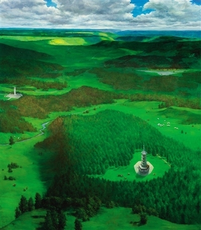 河北塞罕壩林場(chǎng),是“三北”工程建設(shè)的重要區(qū)域?;脑兞趾5娜眽纹孥E,成為近年來主題性美術(shù)創(chuàng)作的重要課題。入選“筑夢(mèng)——我們的新時(shí)代美術(shù)攝影作品展”的譚智群油畫《美麗的塞罕壩》,是在實(shí)地寫生基礎(chǔ)上的藝術(shù)提煉和情感升華。作者以俯視的構(gòu)圖,鋪展?jié)M目蒼翠的美景。畫面左側(cè),清澈的河流蜿蜒向前;畫面右側(cè),白色的雁群逐綠翱翔;遠(yuǎn)方,茂密的森林不斷延伸,風(fēng)力發(fā)電機(jī)林立于山巔,畫面充滿生機(jī)與活力。同樣以俯視的角度處理構(gòu)圖,孔亮油畫《美麗中國(guó)——塞罕壩》則以塞罕壩林場(chǎng)和塞罕塔為視覺中心,蔥蘢的綠意,將意境渲染得更加深邃。翁凱旋油畫《滄海桑田——塞罕壩的前世今生》,通過三聯(lián)畫的形式,在新舊對(duì)比中構(gòu)建時(shí)空長(zhǎng)廊,描繪出塞罕壩的時(shí)代變遷。