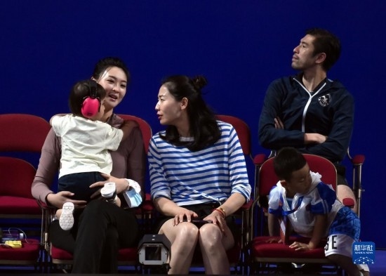 6月16日,原中國女排球員魏秋月(前中)和惠若琪(前左)在場邊觀賽。新華社記者 盧炳輝 攝