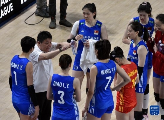 6月16日,中國隊主教練蔡斌(左二)在比賽間隙指導球員。新華社記者 盧炳輝 攝