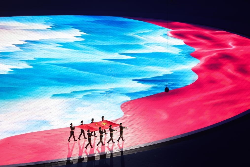 地屏上,一幅紅綢飛掠壯麗河山。8名儀仗兵步伐鏗鏘,護旗入場?!拔覑勰阒袊覑勰愦禾炫畈难砻纭眲尤说馁澑枭钋槌?。