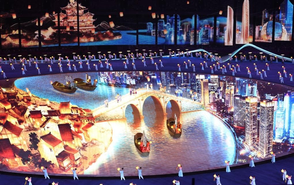 吉祥物“江南憶”破水而出,騰躍而起?!皠?dòng)起來(lái)”的“琮琮”“蓮蓮”“宸宸”彈奏起圓形的“水浪鋼琴”,激活了象征著數(shù)字賦能杭州城市建設(shè)的“芯片面板”。660根數(shù)控光源棒點(diǎn)亮“科技之潮”,AR虛擬半球狀的數(shù)字穹頂營(yíng)造出震撼的立體空間。