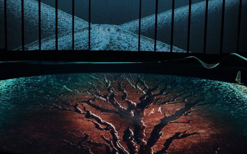 本屆亞運(yùn)會(huì)首次將3D雙威亞技術(shù)應(yīng)用于大型運(yùn)動(dòng)場(chǎng)中。立體飛旋于空中的男女演員與潮共舞,吊著威亞的他們?cè)诳罩型瓿闪烁鞣N高難度動(dòng)作,并與地屏中的浪潮實(shí)時(shí)互動(dòng),踏浪而行,成就了科技與藝術(shù)完美融合。