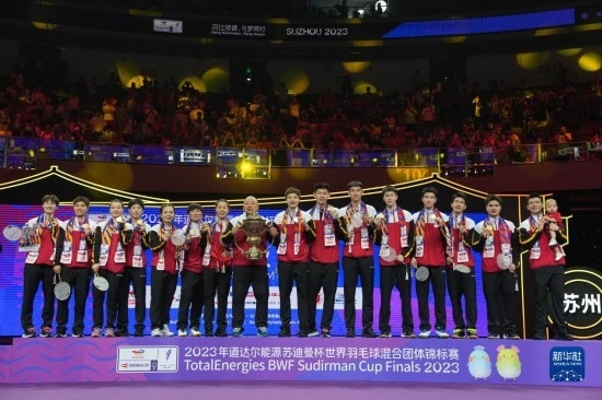 5月21日,2023年蘇迪曼杯世界羽毛球混合團體錦標賽頒獎儀式在江蘇省蘇州市舉行。中國隊在決賽中以3比0戰(zhàn)勝韓國隊,奪得冠軍。圖為中國隊在頒獎儀式上慶祝。新華社記者 杜宇 攝