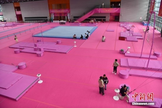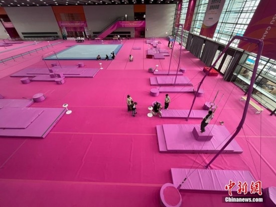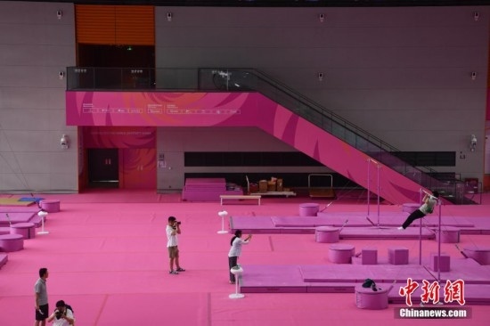 7月14日,成都東安湖體育公園內(nèi),成都大運(yùn)會(huì)體操比賽訓(xùn)練場(chǎng)的粉色布置吸引媒體記者探訪。海綿墊、平衡木、吊環(huán)、鞍馬等設(shè)施均為粉色,充滿青春活力,令人倍感放松。目之所及,海綿墊、平衡木、吊環(huán)、鞍馬等設(shè)施均為粉色。
