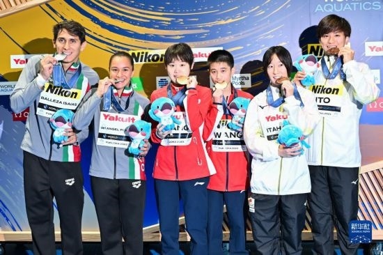 7月15日,冠軍中國(guó)組合王飛龍(右三)/張家齊(左三),亞軍墨西哥組合伊薩亞斯(左一)/佩尼切(左二)和季軍日本組合伊藤?zèng)草x(右一)/板橋美波在頒獎(jiǎng)儀式上合影。新華社記者 張笑宇 攝