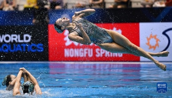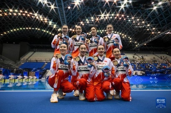 7月21日,中國隊在比賽中。當日,在日本福岡舉行2023年世界游泳錦標賽花樣游泳集體自由自選決賽中,中國隊以329.1687分的成績獲得冠軍。新華社記者 夏一方 攝