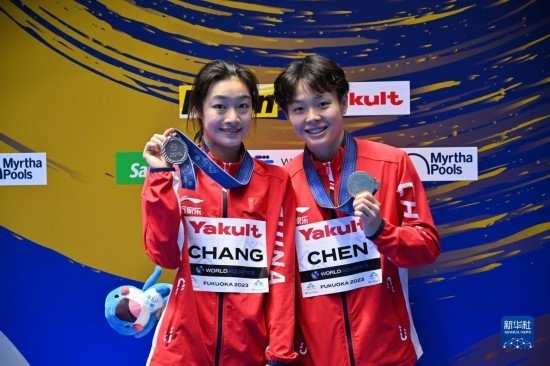 7月21日,冠軍中國選手陳藝文(右)和亞軍中國選手昌雅妮在頒獎儀式上。當日,在日本福岡舉行的2023年世界游泳錦標賽跳水女子單人三米板決賽中,中國選手陳藝文、昌雅妮分別以359.50分和341.50分的成績包攬冠亞軍。新華社記者 張笑宇 攝