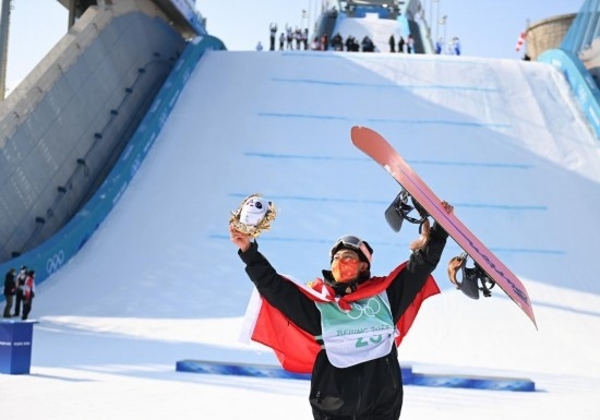2022年2月15日,中國選手蘇翊鳴在頒發(fā)紀(jì)念品儀式后。當(dāng)日,北京2022年冬奧會(huì)單板滑雪男子大跳臺(tái)決賽在北京首鋼滑雪大跳臺(tái)舉行。中國選手蘇翊鳴奪得金牌。新華社記者黃宗治攝