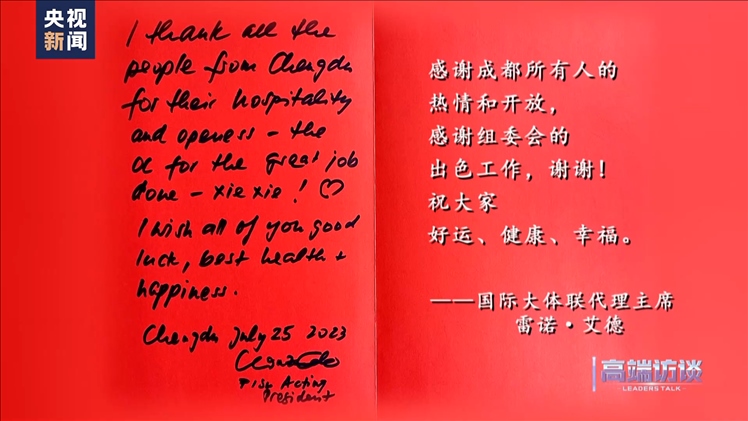 國(guó)際大體聯(lián)代理主席雷諾·艾德在接受總臺(tái)專訪后題詞:感謝成都所有人的熱情和開(kāi)放,感謝組委會(huì)的出色工作,謝謝!祝大家好運(yùn)、健康、幸福。
