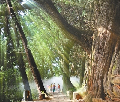 漫步在翠云廊蜿蜒的古道石板路上,松柏木的清香縈繞鼻尖,縷縷陽光穿透樹蔭,側(cè)耳傾聽風拂樹干的聲音——一步一行中,收獲一段愜意時光。