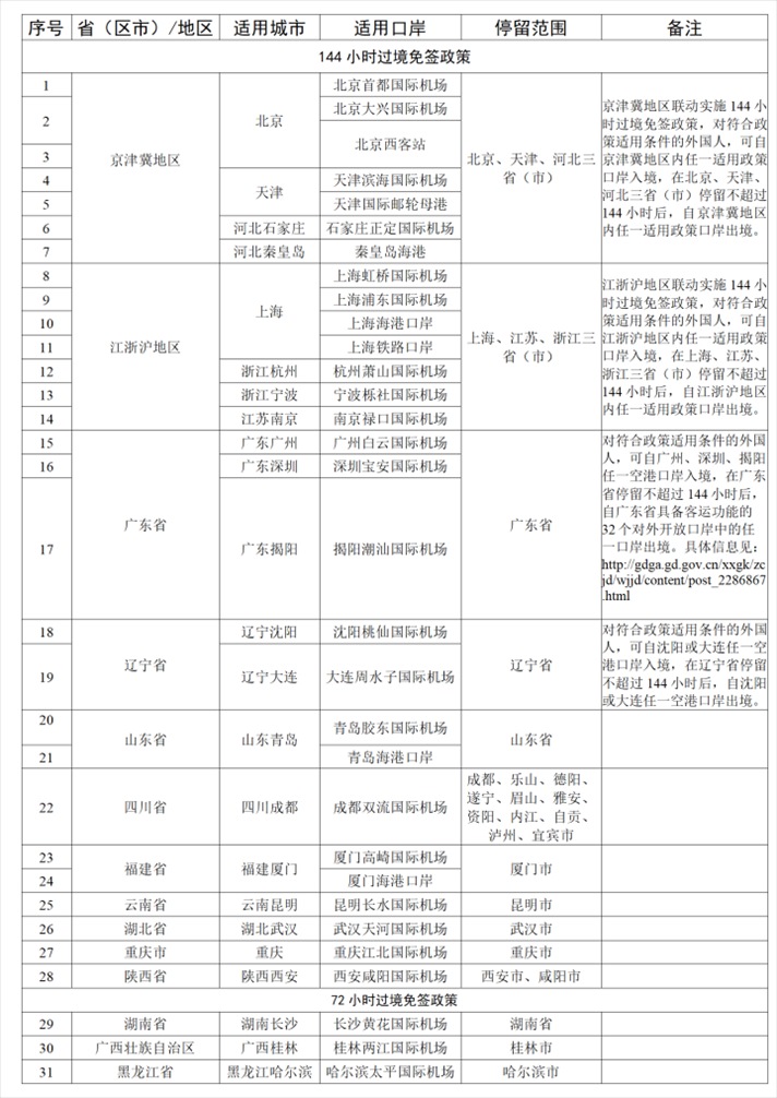 如外國(guó)人符合上述條件,可向我國(guó)20個(gè)城市的邊檢機(jī)關(guān)提出辦理144小時(shí)過(guò)境免簽申請(qǐng),或向3個(gè)城市的邊檢機(jī)關(guān)提出辦理72小時(shí)過(guò)境免簽申請(qǐng),其他城市暫未實(shí)施該項(xiàng)政策。