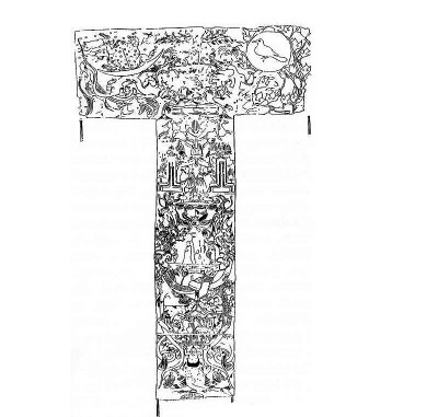 需要指出的是,這一進(jìn)程和墓主人辛追靈魂升仙的進(jìn)程是同步的。馬王堆漢墓T形帛畫的構(gòu)圖和漢代畫像石天界、人間、地下世界的三段模式非常近似,所以很多學(xué)者據(jù)此將T形帛畫也劃分為天界、人間、地下三部分。但這種看法我不贊成。我比較贊同T形帛畫的主題是引魂升天的主張。日本京都大學(xué)教授曾部川寬對(duì)漢代靈魂升仙的主題有非常深入的研究。1981年他出版的《向昆侖山升仙——古代中國(guó)人描繪的死后世界》(《崑崙山への昇仙——古代中國(guó)人が描いた死後の世界》)中,指出這幅非衣的主題就是升仙主題。整幅T形帛畫描述的是墓主人辛追升仙的進(jìn)程。從下到上,T形帛畫中央整個(gè)中軸貫穿著的是一個(gè)升騰的主題。陰陽(yáng)兩條龍自下而上在中央部分穿璧而過(guò),托舉起魂車?;贶嚿系暮诵娜宋锿ǔUJ(rèn)為就是墓主人辛追。按照這一解釋,中間部分描繪的并不是我們生活的人間,而是從地下向天界升騰的墓主人辛追不斷升向仙界的魂魄。畫面上她的魂魄正被二龍牽引的魂車引向天門。從時(shí)間上說(shuō),辛追的魂魄將要進(jìn)入的,同樣是由死亡而再生的進(jìn)程。