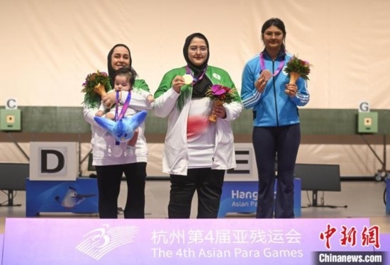 在SH1級(jí)女子10米氣手槍頒獎(jiǎng)儀式中,伊朗選手薩雷赫抱著三個(gè)月大的兒子登上亞軍的領(lǐng)獎(jiǎng)臺(tái)。與獎(jiǎng)牌、花束一同呈上的,還有官方特意贈(zèng)予小朋友的杭州第4屆亞殘運(yùn)會(huì)吉祥物“飛飛”玩偶。