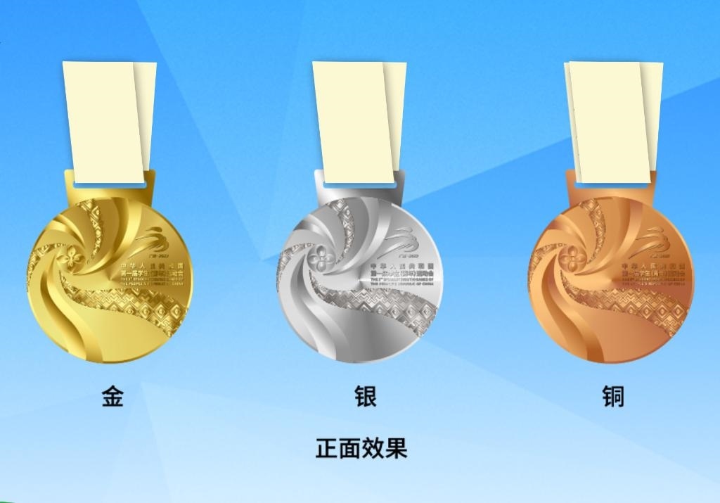 首屆學(xué)青會(huì)獎(jiǎng)牌正面采用繡球、壯錦等廣西元素,以繡球?yàn)樵O(shè)計(jì)焦點(diǎn),通過壯錦飄帶向外綻放,如一朵盛開的鮮花,表達(dá)歡迎四方友人共赴學(xué)青盛會(huì)的美意;獎(jiǎng)牌背面以廣西銅鼓鼓面為原型,中心太陽紋象征著年輕人的活力和熱情,四方配以圖騰鳥,有著吉祥的寓意;外圈環(huán)繞了學(xué)青會(huì)的英文名稱和銅鼓經(jīng)典紋飾云雷紋。獎(jiǎng)牌整體寓意“團(tuán)結(jié)、活力、綻放”。