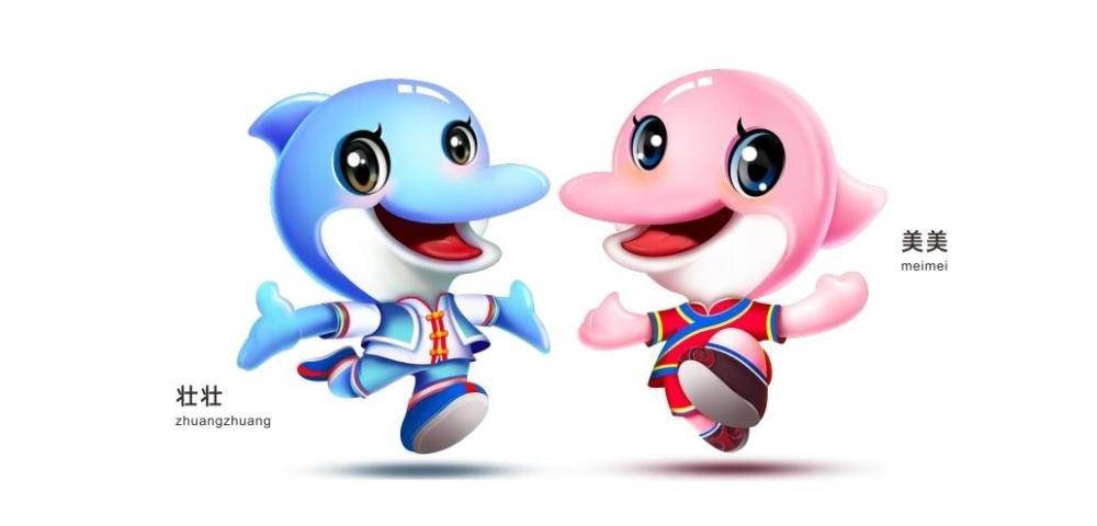 首屆學(xué)青會(huì)吉祥物“壯壯”“美美”,是一對(duì)活潑律動(dòng)的海豚形象,以中華白海豚為原型創(chuàng)作,搭配壯錦和民族服飾,凸顯廣西的民族特色和地域風(fēng)格。