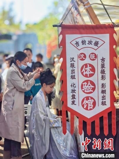 啟動儀式上,熱愛漢服文藝的市民登臺,帶來群舞、獨舞、古典舞等漢服舞蹈。現(xiàn)場舉辦漢服市集,不少市民參與漢服體驗,欣賞、體驗或購買傳統(tǒng)飾品、非遺文創(chuàng)產(chǎn)品,參與投壺、捶丸和飛花令等活動。