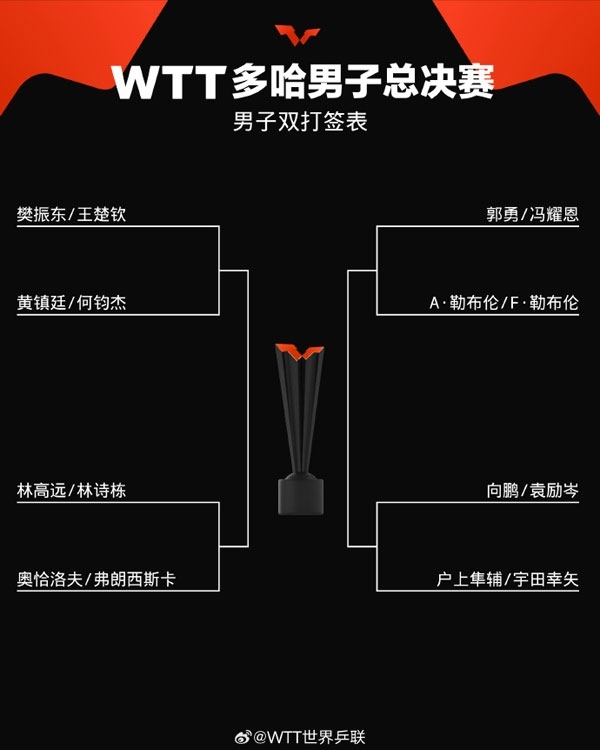男雙選手分別是:樊振東/王楚欽、張禹珍/林仲勛、宇田幸矢/戶上隼輔、林高遠(yuǎn)/林詩(shī)棟、艾利克斯· 勒布倫/費(fèi)利克斯·勒布倫、帕特里克·弗朗西斯卡/迪米特里·奧恰洛夫、莊智淵/林昀儒、黃鎮(zhèn)廷/何鈞杰。