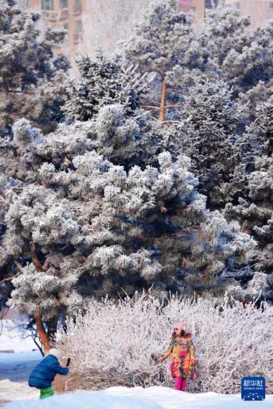 當(dāng)日,降雪后的冰城哈爾濱市出現(xiàn)霧凇景觀,大地銀裝素裹,玉樹瓊枝美如畫卷。