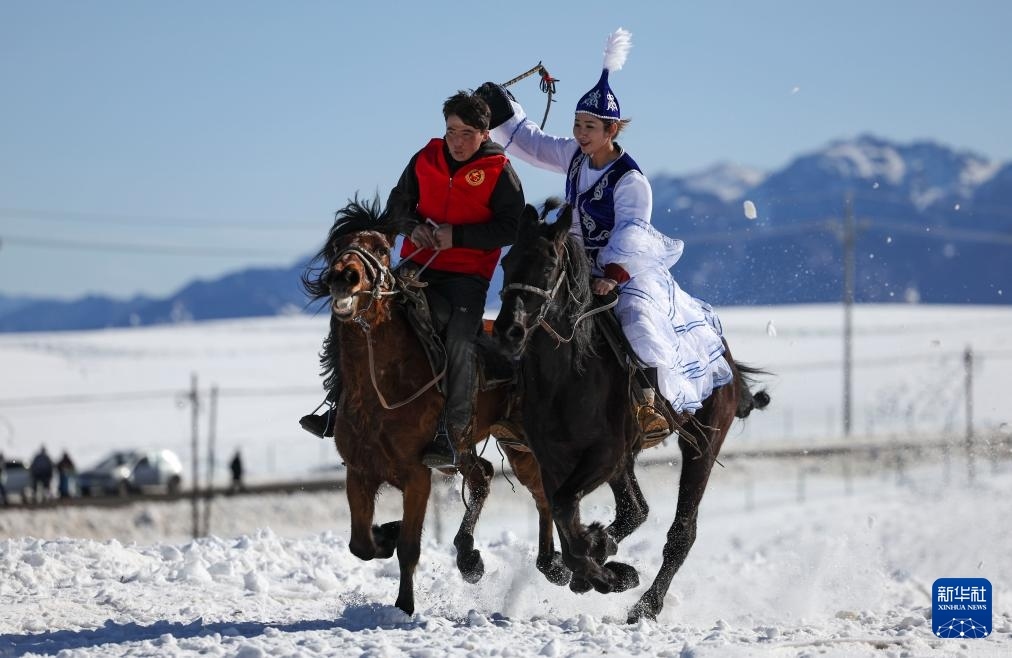 農(nóng)歷大年初二,新疆烏魯木齊縣“春節(jié)八天樂”系列活動(dòng)——傳統(tǒng)體育民俗鬧新春在甘溝鄉(xiāng)進(jìn)行。村民們在冰雪覆蓋的烏拉斯臺(tái)草原上進(jìn)行雪地賽馬、“姑娘追”、馬上拾銀、叼羊等比賽,歡度新春。
