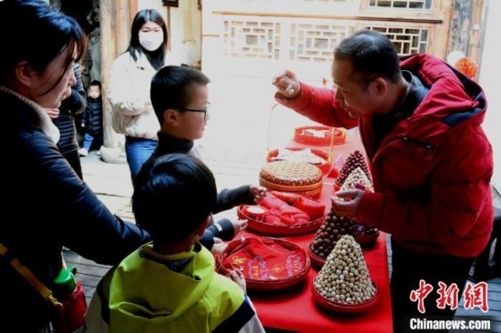 福建民俗博物館內喜籮攤位前吸引孩子觀看,感受傳統(tǒng)年味。 中新網(wǎng)記者劉可耕攝
