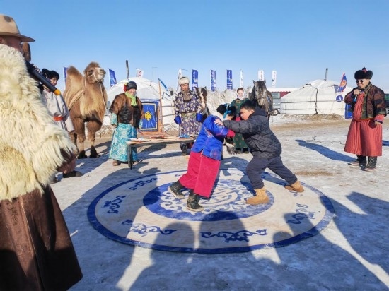 為迎接“十四冬”,呼倫貝爾推出了豐富多彩的文化活動(dòng)和產(chǎn)品。陳巴爾虎旗的牧民巴圖蘇和與合伙人在莫爾格勒河景區(qū)推出“天天冰雪那達(dá)慕”活動(dòng),設(shè)雪地搏克、騎馬射箭、“冰地嘎拉哈”、駱駝爬犁等項(xiàng)目,讓游客沉浸式體驗(yàn)蒙古族文化與傳統(tǒng)運(yùn)動(dòng)。首次嘗試雪地搏克的河北固安游客張瑞堂,與一位蒙古族少年友好競(jìng)技,他的姐姐則用手機(jī)記錄下了這段珍貴的經(jīng)歷。