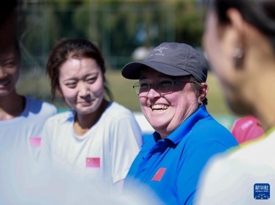 4月26日,中國(guó)女曲隊(duì)主教練安南(右二)在訓(xùn)練中與隊(duì)員溝通。新華社記者 馬平 攝