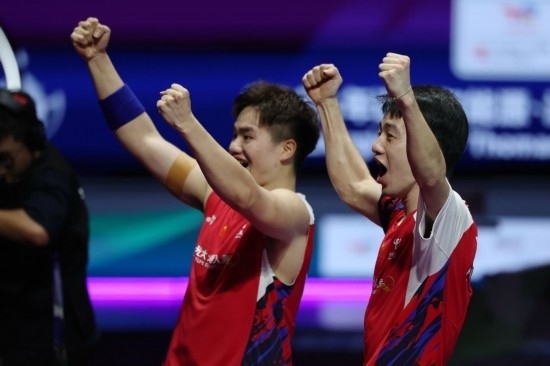 5月5日,中國隊(duì)組合梁偉鏗(左)/王昶在男子雙打比賽后慶祝勝利。新華社記者 陳斌 攝