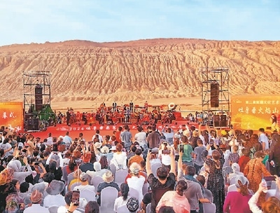 游客在新疆吐魯番火焰山下欣賞交響音樂(lè)會(huì)。 劉 健攝(人民圖片)