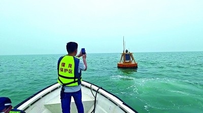 廣西合浦儒艮國家級自然保護區(qū)工作人員檢查海洋哺乳動物水下聲學監(jiān)測浮標。