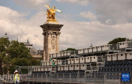 這是6月4日在位于法國(guó)巴黎市中心的亞歷山大三世橋拍攝的臨時(shí)比賽場(chǎng)地搭建現(xiàn)場(chǎng)。這里將是巴黎奧運(yùn)會(huì)多個(gè)比賽項(xiàng)目的終點(diǎn),包括公路自行車個(gè)人計(jì)時(shí)賽、游泳馬拉松、鐵人三項(xiàng)比賽。新華社記者 高靜 攝