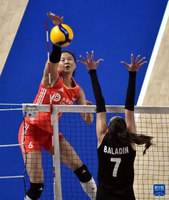 6月15日,中國隊(duì)球員龔翔宇(左上)在比賽中吊球。新華社記者盧炳輝攝