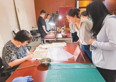 觀眾現(xiàn)場(chǎng)觀摩檔案修裱工作。本報(bào)記者 黃敬惟攝