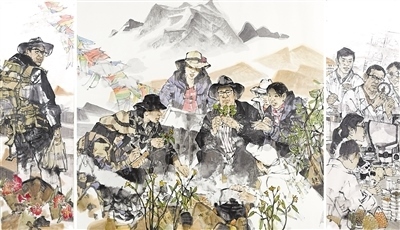 在專題展覽中,一些美術(shù)工作者自發(fā)圍繞共產(chǎn)黨員形象創(chuàng)作的作品,憑借獨(dú)特的構(gòu)思布局、藝術(shù)手法等令人矚目。像“第七屆全國畫院美術(shù)作品展”上,陳勇中國畫《黨員突擊隊(duì)·抗洪戰(zhàn)士》以組畫的形式、連環(huán)畫的敘事邏輯,展現(xiàn)了黨員突擊隊(duì)不畏危難、沖鋒在前的英雄氣概?!皶r(shí)代之光——第五屆中國油畫展”上,劉文偉油畫《勞動(dòng)者·記港珠澳大橋建設(shè)》則采用近距離視角,以粗糲大氣的筆觸,描繪大橋建設(shè)者中的黨員肖像。這些新作反映出美術(shù)工作者在創(chuàng)作中對共產(chǎn)黨員群體的自覺關(guān)注,以及力求突破“模式化”的創(chuàng)作實(shí)踐。