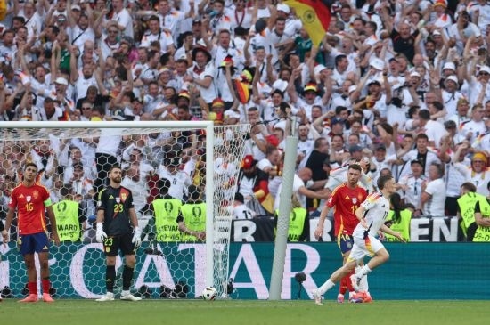 久攻之下,德國(guó)隊(duì)終于在第89分鐘扳平比分,米特爾施泰特左路傳中,基米希頭球回?cái)[,維爾茨抽射入網(wǎng)。兩隊(duì)在常規(guī)時(shí)間1:1戰(zhàn)平,比賽進(jìn)入加時(shí)賽。第106分鐘,德國(guó)隊(duì)穆夏拉射門擊中西班牙隊(duì)庫(kù)庫(kù)雷利亞手臂,后者當(dāng)時(shí)在本方禁區(qū)內(nèi)防守,但主裁判并沒(méi)有判罰點(diǎn)球,VAR(視頻助理裁判)也沒(méi)有介入。