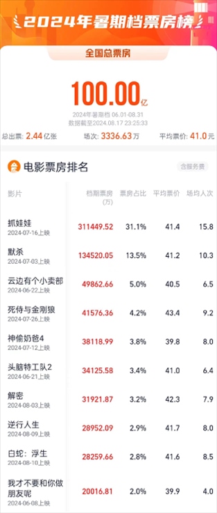 據(jù)網(wǎng)絡(luò)平臺(tái)實(shí)時(shí)數(shù)據(jù),截至8月17日23時(shí)25分,2024年暑期檔(6月-8月)檔期總票房(含預(yù)售)突破100億元。