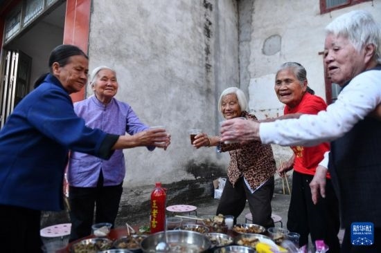 10月6日,在柳州市柳江區(qū)三都鎮(zhèn)白見村,老人們在重陽節(jié)百家宴中共同舉杯。