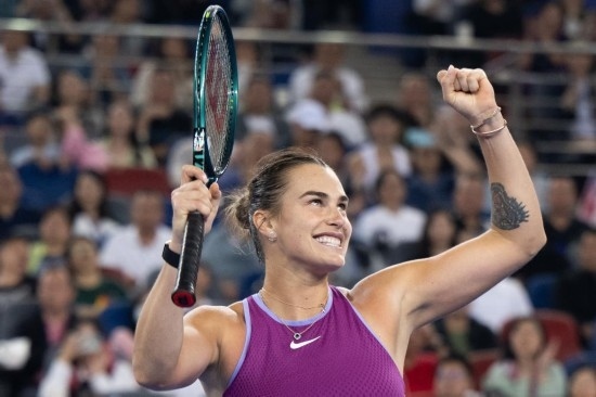 10月13日,薩巴倫卡在獲勝后慶祝。當(dāng)日,在武漢網(wǎng)球公開賽女單決賽中,薩巴倫卡戰(zhàn)勝鄭欽文,奪得冠軍。新華社記者 肖藝九 攝