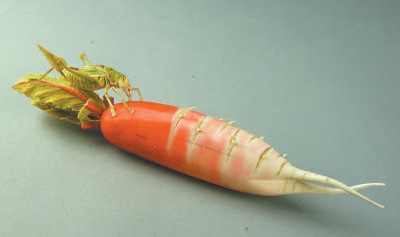 這根“蘿卜”長約27厘米,重229克。根莖由上部的紅色漸變?yōu)橹胁康姆奂t和根部的白色,根須自然彎曲,葉片呈綠色。蘿卜上一只蟈蟈伸出前肢正由葉片爬向莖部,也顯得動感十足。