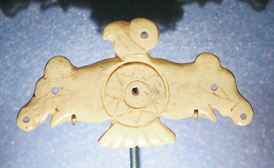 玉鷹是凌家灘文化最具代表性的器物之一。鷹側(cè)首傲視,雙翅張開,翅端各為一豬首形象,可能以豬作為財(cái)富的象征。鷹腹刻八角星紋,這種紋樣在凌家灘出土的玉版和新石器時(shí)代眾多陶器上都有出現(xiàn)。這件玉鷹可能是舉行祭祀儀式時(shí)所用之物,鷹、豬、八角星紋集于一器,體現(xiàn)了先民崇尚萬物有靈的宇宙觀。