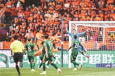 北京國安隊(duì)門將韓佳奇(上右)在比賽中撲救。