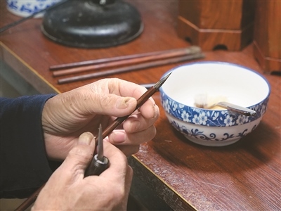 把毛料放在水中仔細(xì)清洗,就著燈光剔除一根根細(xì)微雜毛,將清理后的毛料聚合成圓直光滑、攏抱不散的錐形……走進(jìn)涇縣涇川鎮(zhèn)宣筆制作技藝代表性傳承人佘征軍的工作室,他正在為一支紫毫筆制作筆頭?!鞍拙右子性娫疲侵瞬蔀楣P,千萬毛中揀一毫’。此句講的是宣筆制作工藝的復(fù)雜精細(xì)?!辟苷鬈娬f。