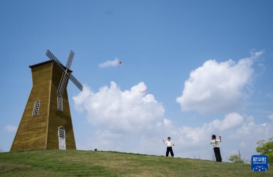 4月6日,在成都西湖公園,兩個小朋友在草地上放風(fēng)箏。新華社記者 江宏景 攝