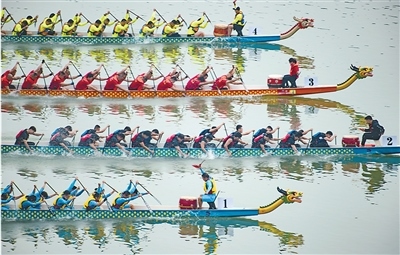 “比賽項(xiàng)目很豐富,有200米、500米直道賽以及搶紅奪標(biāo)賽,今年還新設(shè)了龍舟拔河?!惫ふf(shuō),傳統(tǒng)的龍舟一般坐22個(gè)人,現(xiàn)在比賽用的小龍舟通常坐12個(gè)人。