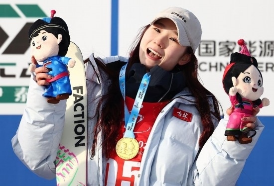 劉夢婷的雪板上有一個“谷”字,她解釋說這是谷愛凌同款定制雪板。“我很喜歡她的風格,把她作為我的榜樣,激勵我進步?!?/p>