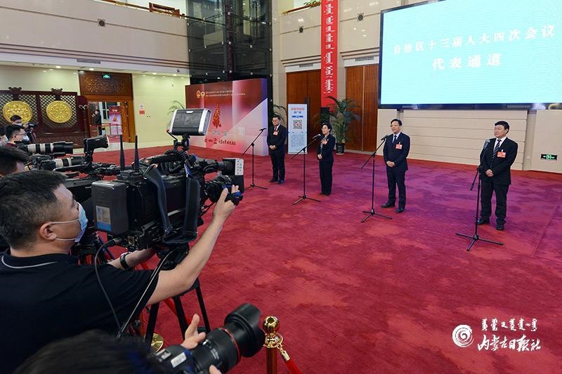 1月27日晚,自治區(qū)十三屆人大四次會(huì)議“代表通道”集中采訪(fǎng)活動(dòng)在內(nèi)蒙古人民會(huì)堂玻璃廳舉行,8位人大代表分兩組“亮相”。這是自治區(qū)人大首次開(kāi)通“代表通道”。圖為人大代表樸成奎、胡成東、云霖瓊和李全文4位代表(從左至右)回答記者提問(wèn)。內(nèi)蒙古日?qǐng)?bào)記者 金泉 攝