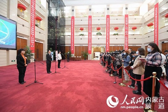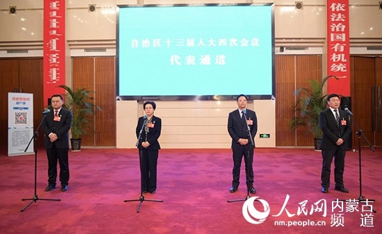 內(nèi)蒙古開啟首次代表通道,陳功明代表(左一)就生態(tài)建設(shè)問題答記者問。 陳立庚 攝