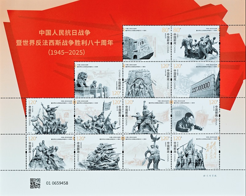 這是9月3日拍攝的《中國(guó)人民抗日戰(zhàn)爭(zhēng)暨世界反法西斯戰(zhàn)爭(zhēng)勝利八十周年》紀(jì)念郵票小型張。