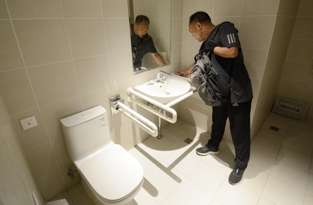 2021年7月15日,無障礙專家在北京延慶賽區(qū)冬奧村檢查室內衛(wèi)生間無障礙設施。新華社記者 李欣 攝