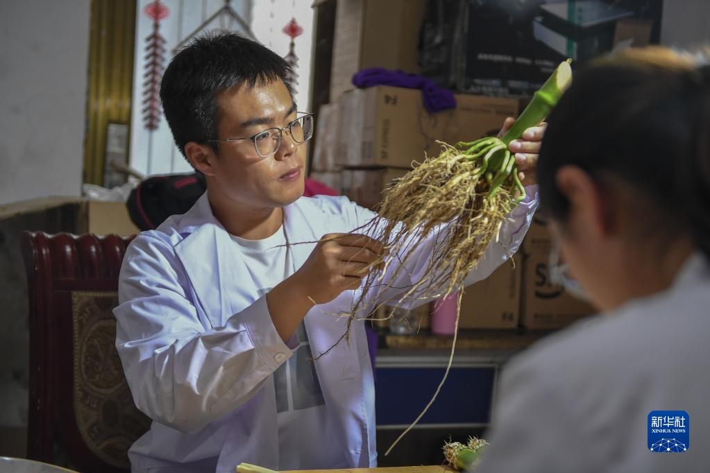 2021年8月2日,在吉林省梨樹縣四棵樹鄉(xiāng)三棵樹村“科技小院”,中國農(nóng)業(yè)大學(xué)學(xué)生沙野查看玉米根系樣本。新華社記者 張楠 攝