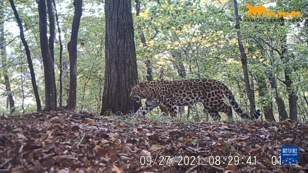 這是2021年9月27日利用“天地空一體化監(jiān)測系統(tǒng)”在東北虎豹國家公園內(nèi)監(jiān)測到的野生東北豹影像(視頻截圖)。新華社發(fā)